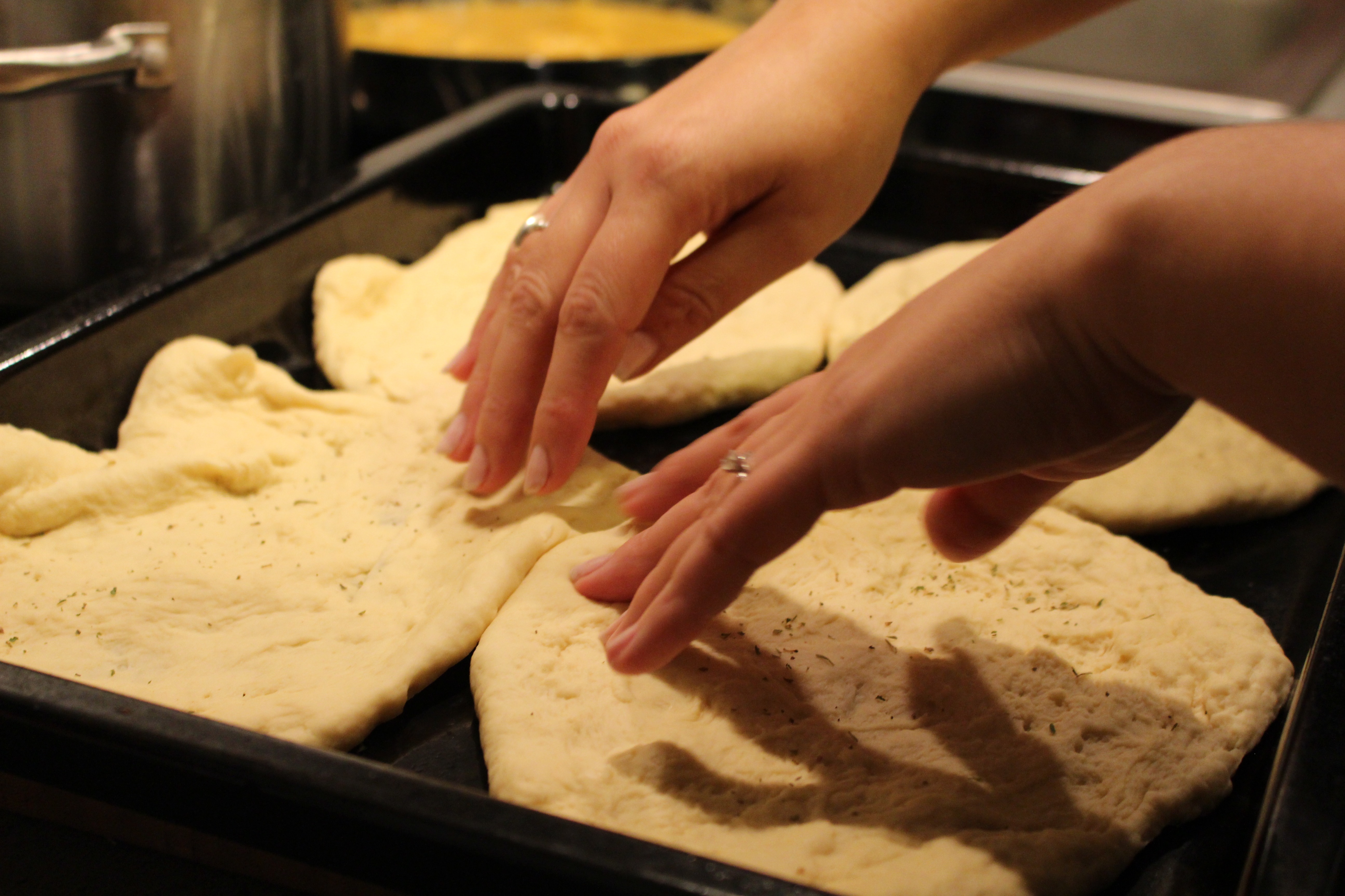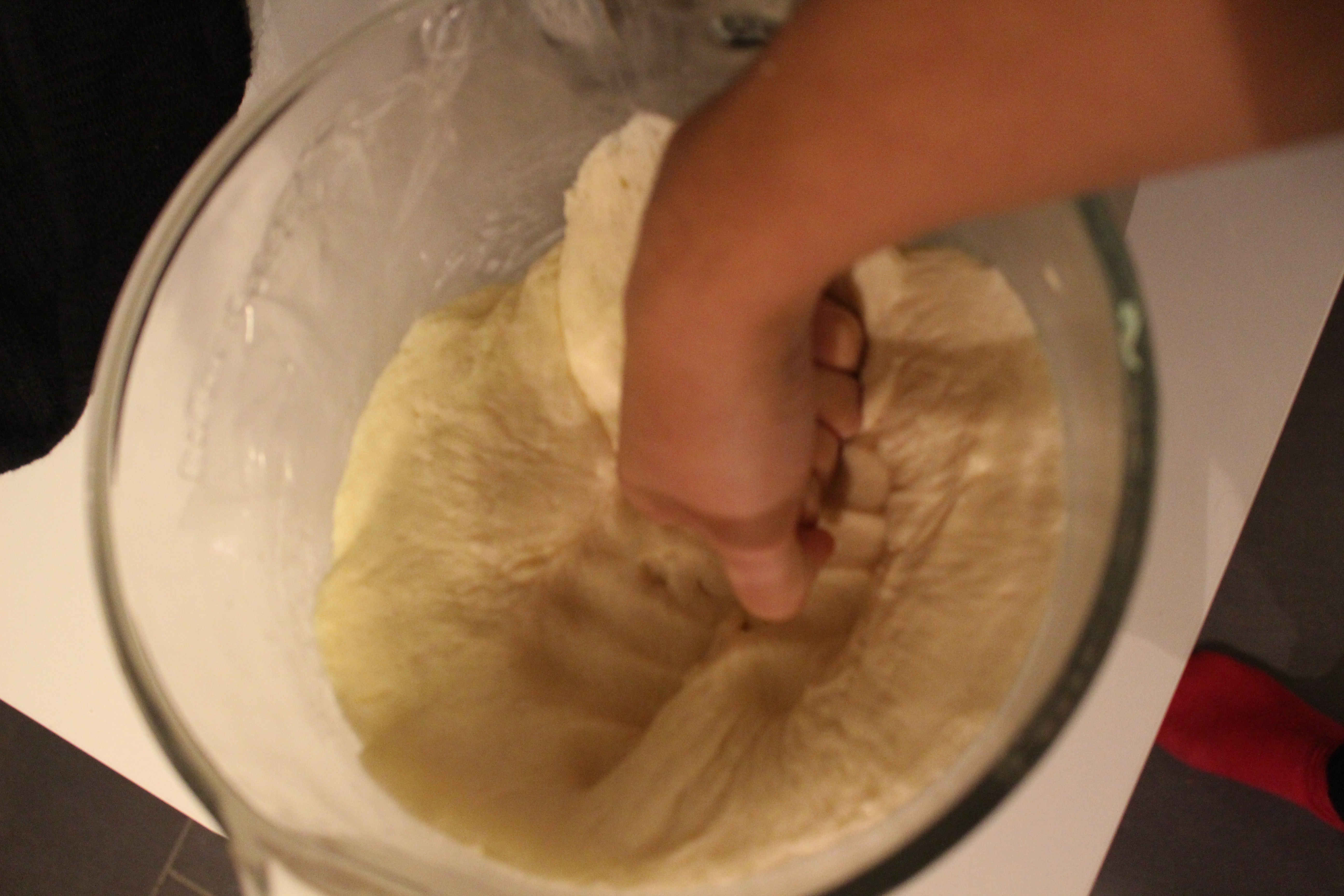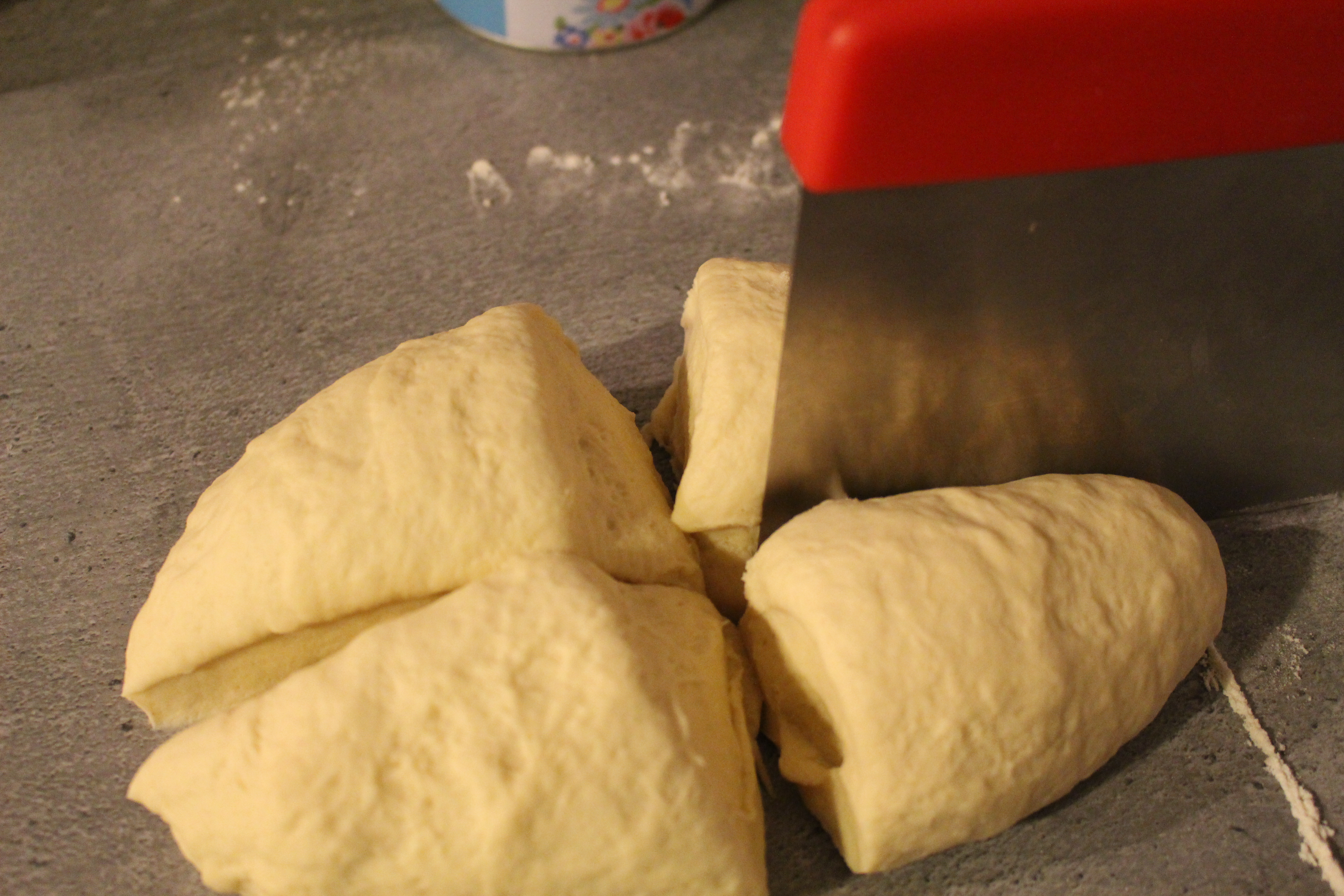 Punch down the dough and knead again, divide up into 6 (4 if you want them big!) balls. Cover up the balls when you are not working with them to stop them forming a crust.