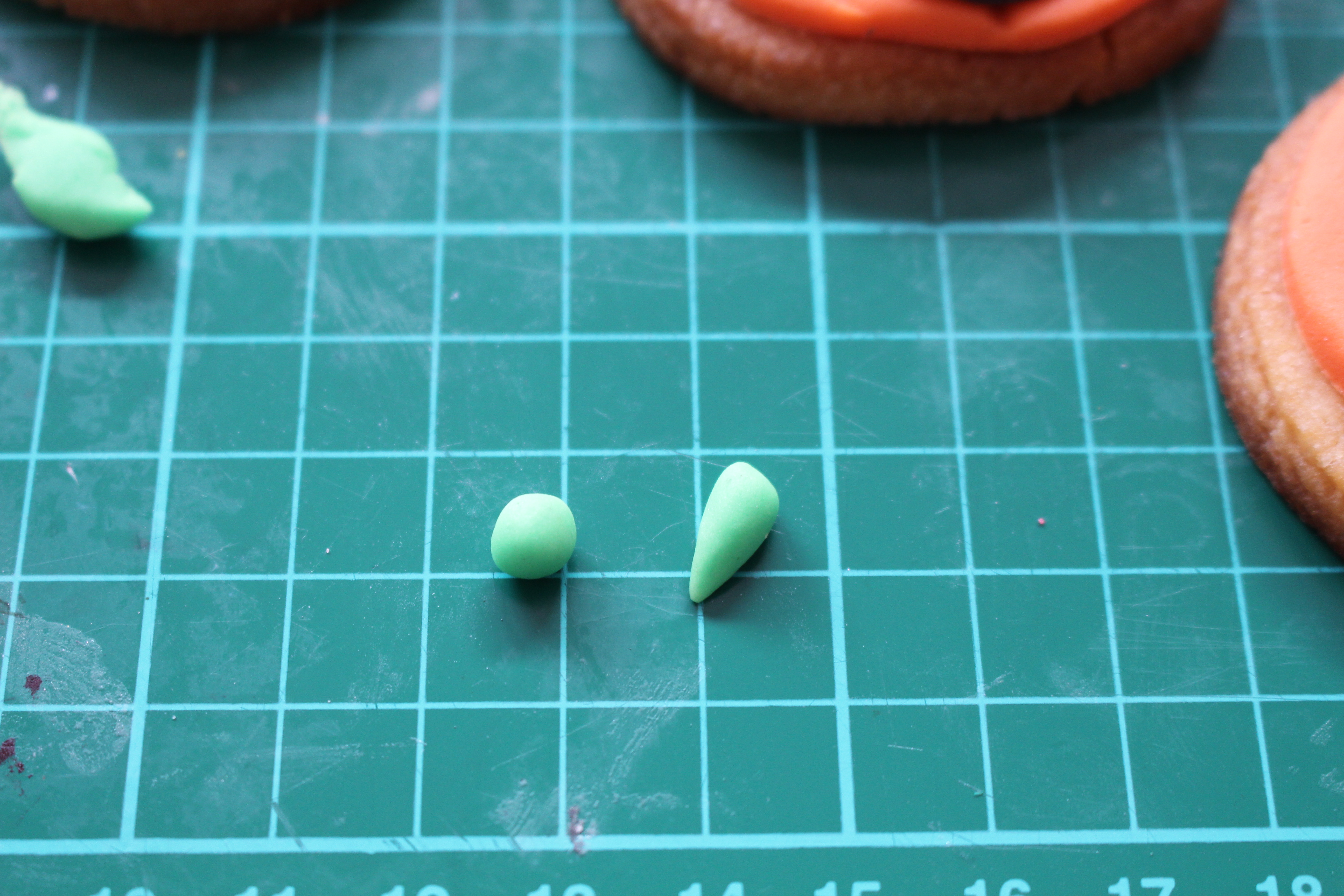 Next, using a small amount of green sugar paste make your stem for the top of your pumpkin – do this by rolling a ball and then rolling in your fingers to make it into a tear drop shape.