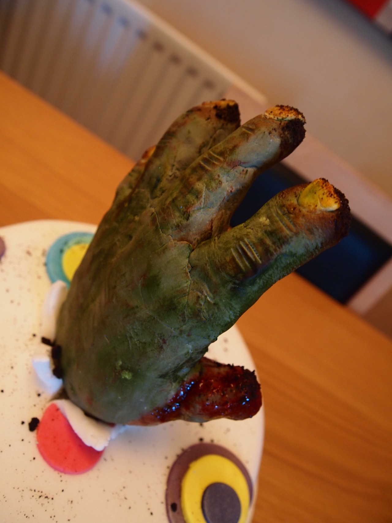 As you can see with mine, I managed to break off a couple of fingers, this is because I made the error of putting icing sugar into my glove before filling it with rice krispies, this made it far to dry and meant some of my fingers fell off… its a zombie so actually its OK to have a few fingers missing Any large gaps fill them with thick royal icing before covering with modelling paste.