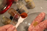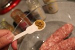 With your hands, mix the spices into the sausage meat. Roll into small meatballs with your hands and place them to one side ready for cooking.