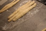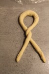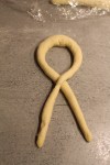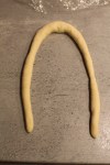 Roll and stretch each piece with the palms of your hands into a 24 inch rope, holding the ends and slapping the middle of the rope on the counter as you stretch.