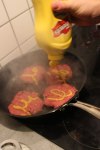 You will know your burgers are ready to be turned when the edges start to turn brown. When this happens give each a squeeze of mustard on the top. Add a little more salt and pepper, then give the burgers a flip.