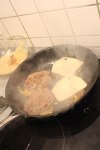 Using a spatula, press down on each burger. Then add one slice of cheese to 2 of the burgers. Place a lid (or in our case a tin) over the top of the pan which will speed up the melting process.