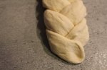 With a dab of water, stick the end pieces together and position your plait onto a tray lined with baking parchment. Leave this for 30 minutes – 1 hour until it has puffed up.
