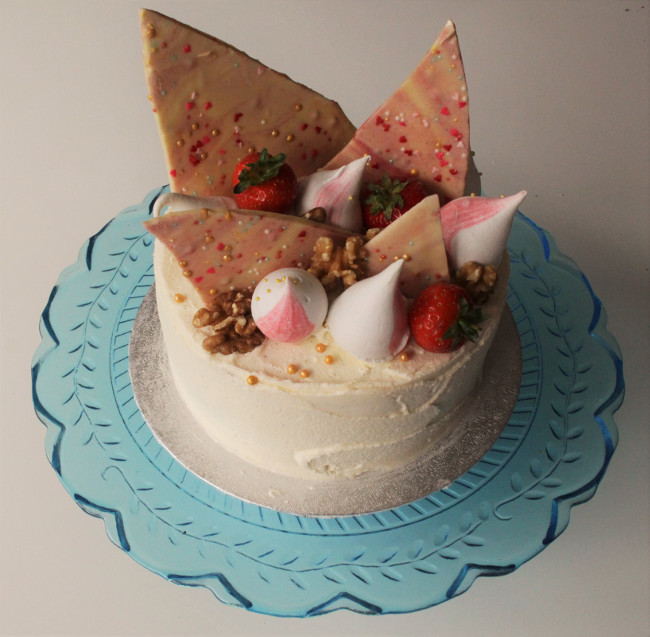 To stick with the theme, I made some pink and white meringue kisses (Recipe here!) Finally I scattered some walnuts, strawberries and more golden sugar pearls.