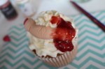 Using a 1M tip, ice your cupcake and place your finger on the top. Finally add a spoon of jam to the end of your finger and allow it to dribble down the buttercream. (Need a buttercream recipe? Click here!)
